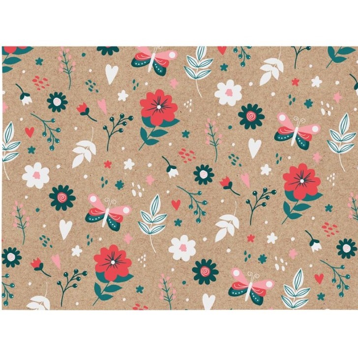 Celoroční balicí papír kraft s motivem listů, květů a motýlků působí elegantně a přirozeně. Je ideální pro každou