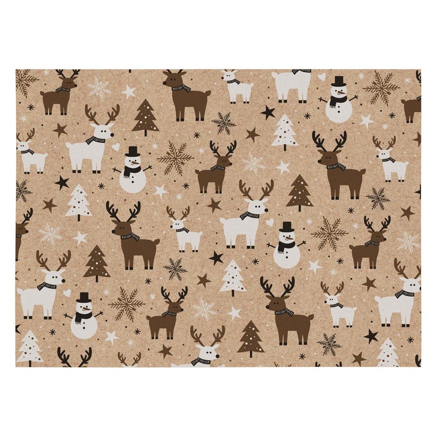 Vánoční kraftový balicí papír s motivem vánočních stromečků, sobů a sněhových vloček.