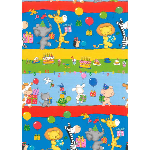 Dětský barevný papír s veselými obrázky zvířátek s dárky a balónky