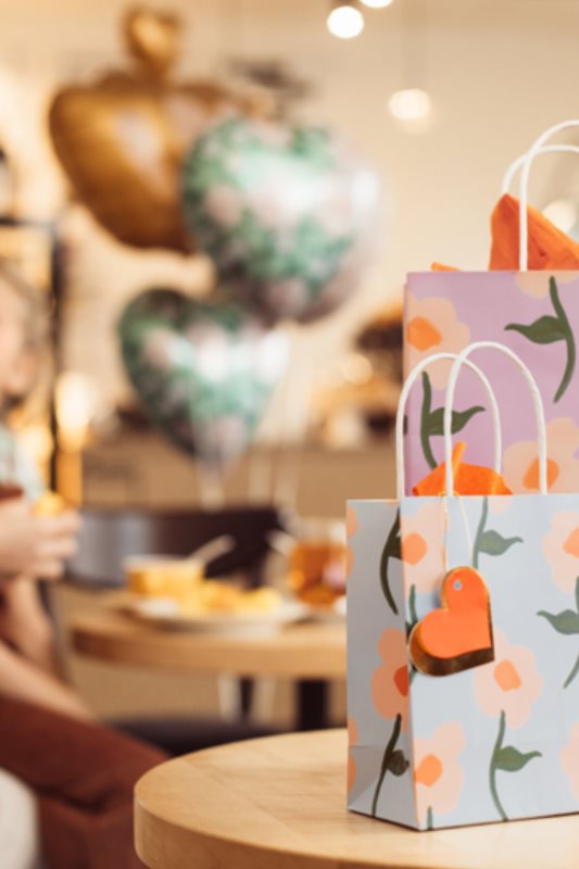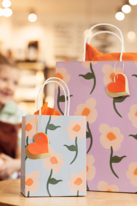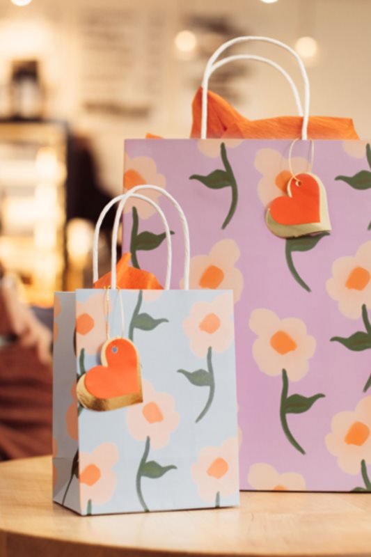 Dárková taška Flowers v modré barvě s barevným potiskem a 2 visačkami ve tvaru srdíček, velikost bez uch cca 8 x 14 x 18 cm.