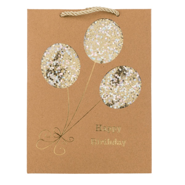 Do dárkové tašky s motivem glitrových balónků a zlatým nápisem Happy Birthday snadno zabalíte jakýkoli narozeninový dárek.