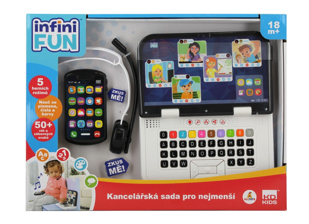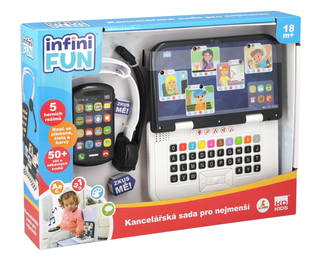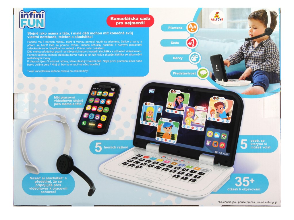 - První realistický set pro home office! Sada obsahuje dětský počítač, sluchátka a telefon. Počítač obsahuje 5 herních režimů – objevování, písmena, čísla, barvy a hru „buď jako“ Počítač má zvukový režim v CZ/SK verzi, telefon má zvukové efekty a hraje hudbu; sluchátka jsou bez elektronické funkce.
