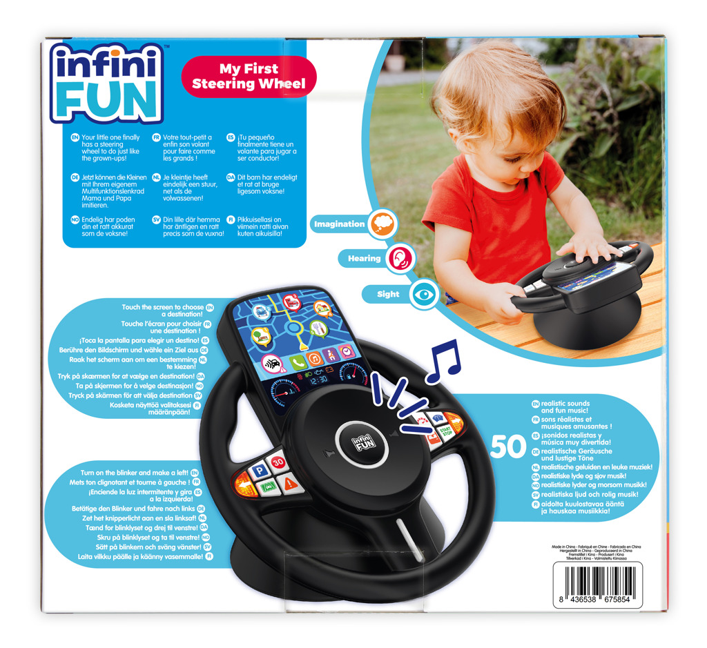 - Elektronický volant, který má spoustu funkcí: brzda, plyn, dotyková obrazovka, navigace, rádio (50 hudebních melodií), klakson, blinkry. Hračka je vhodná pro děti od 18 měsíců .Vyžaduje 2× AAA baterie, které jsou součástí balení.