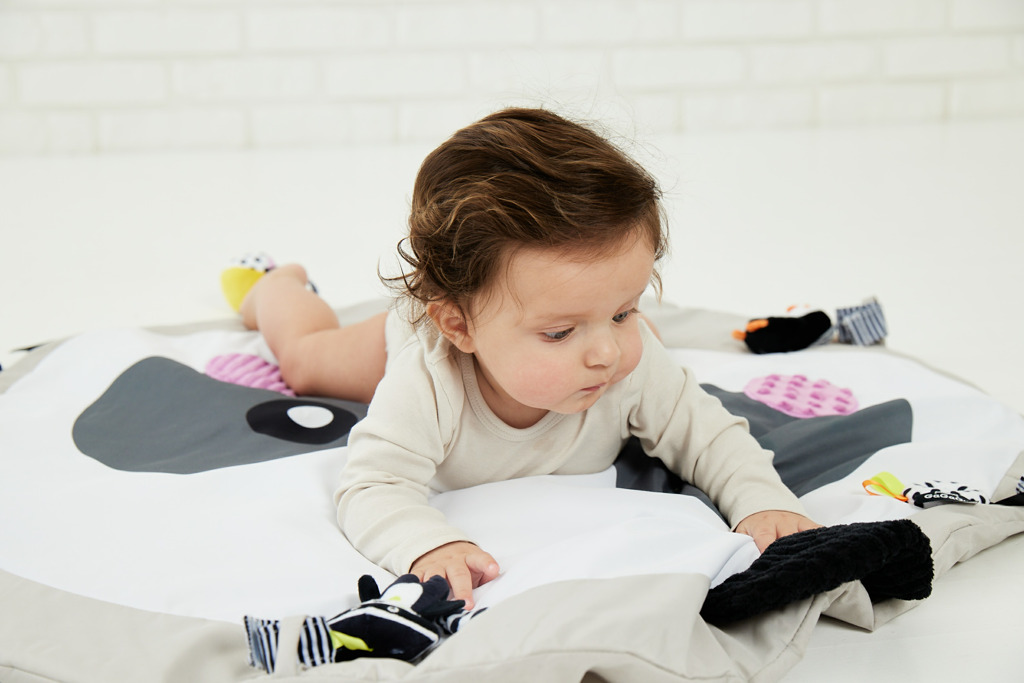 - Velikost: 90 cm Pandí uši vyrobené ze šustivých materiálů s různou texturou. Tvář pandy je vyrobená z různých textur. Smyčky na okrajích podložky umožňují připevnit další hračky a přizpůsobit podložku.