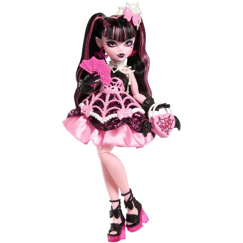 Panenka Draculaura oslavuje své 16. narozeniny s božským vzhledem smrti, který se skládá z upířích šatů a strašidelných doplňků. Má na sobě saténově růžové šaty se super pavučinovou sukní a černé rukavice, k tomu perlový náhrdelník přes ramena a boty na podpatku s motýlky pro fantastický nádech.