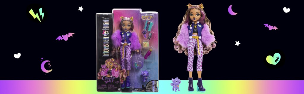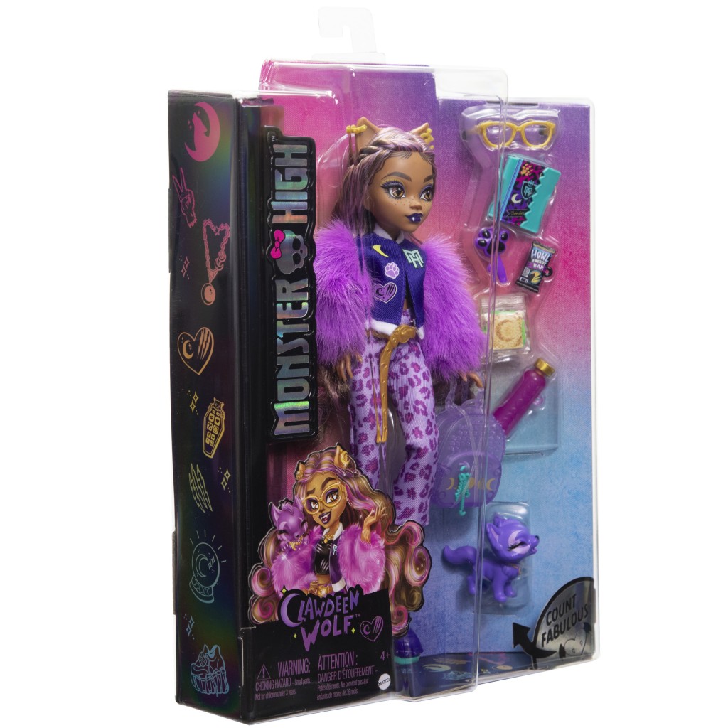 - Příšerka monsterka Clawdeen Wolf™ Monster High™ je ve svém rozkošném fialovém provedení od hlavy až k patě stylovou vlkodlačí panenkou. Je dodávána se svým mazlíčkem Crescent™ v podobě kočky a 6 doplňky pro vyprávění příběhů, jako jsou například batoh, kniha a svačinka!