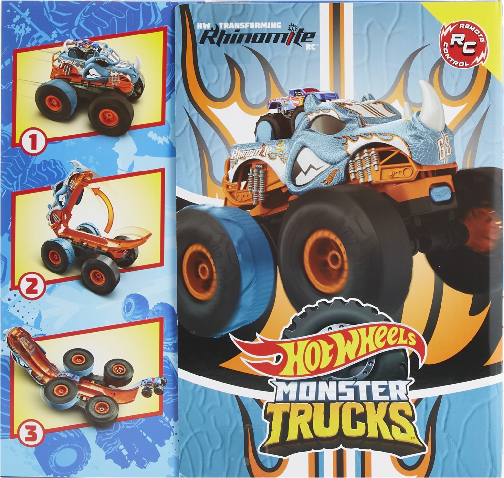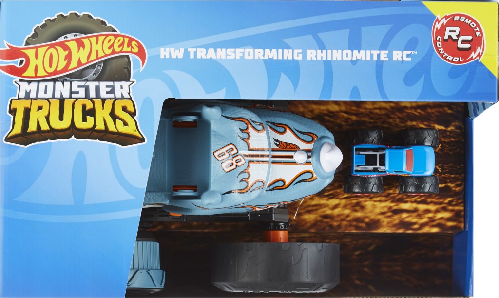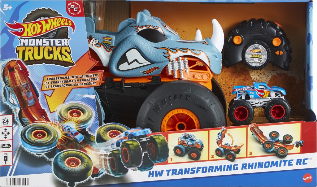 - Bourejte, rozbíjejte a uhánějte šílenou rychlostí s autem Hot Wheels® RC Monster Truck Transformující se Rhinomite! Tento Monster Truck na dálkové ovládání v měřítku 1:12 je vybaven masivními pneumatikami, autentickými dekory a režimem Dynamite – velký Monster Truck se transformuje na motorový zrychlovač pro menší Monster Trucky v měřítku 1:64. Dokáže je vystřelit až do výšky 91 cm! Součástí balení je jeden model Race Ace™ v měřítku 1:64 – během RC hry ho uložte do lože většího kamionu a po velké proměně ho vypusťte pomocí zrychlovače. Předvádějte parádní triky a užijte si jízdu o rychlosti až 9 km za hodinu. Barvy a provedení se mohou lišit.