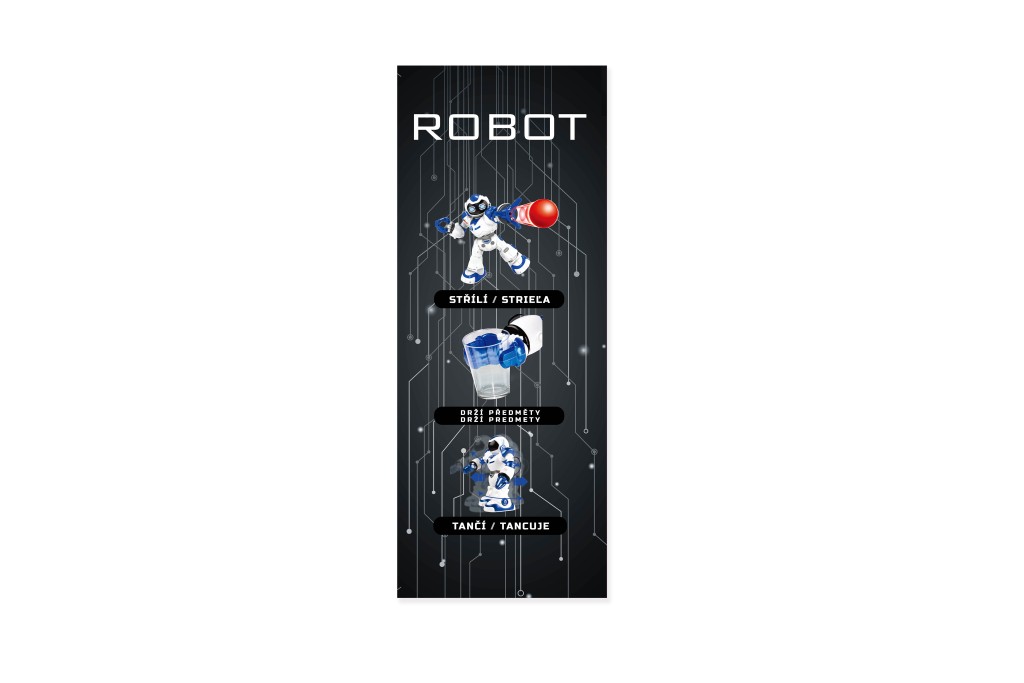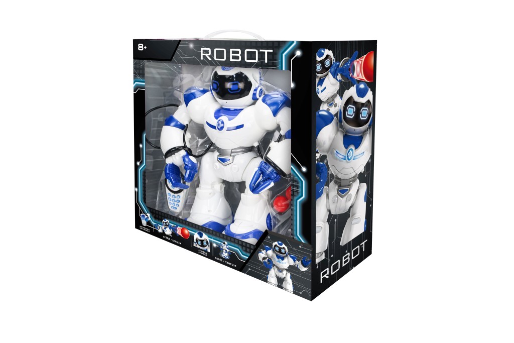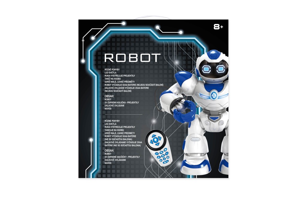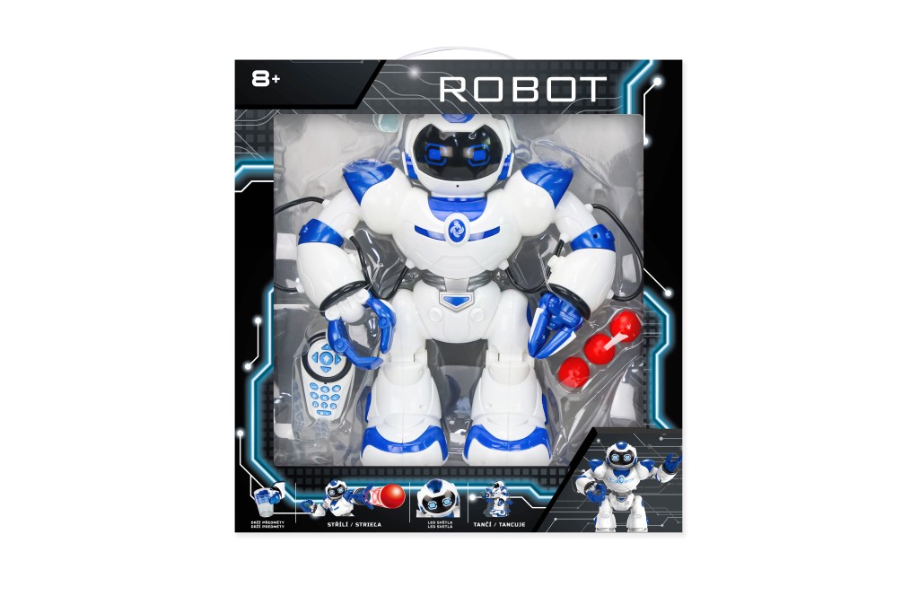 - Interaktivní robot kosmonaut je na dálkové ovládání o velikosti cca 40 cm. Robot umí světelné efekty. Robota, který tančí, si zamiluje opravdu každé dítě i dospělý! Stiskněte melodii na dálkovém ovládání a robot začne tančit. Umí tančit na tři melodie, pohybuje se dopředu, dozadu, otáčí se doleva i doprava. Robotickou rukou střílí projektory a při střelbě po stisknutí tlačítka na ovladači je slyšet zvukový efekt střelby. Díky dálkovému ovladači se dá ovládat hlasitost a pouštět světelné a zvukové efekty. Udrží malé, lehké předměty.