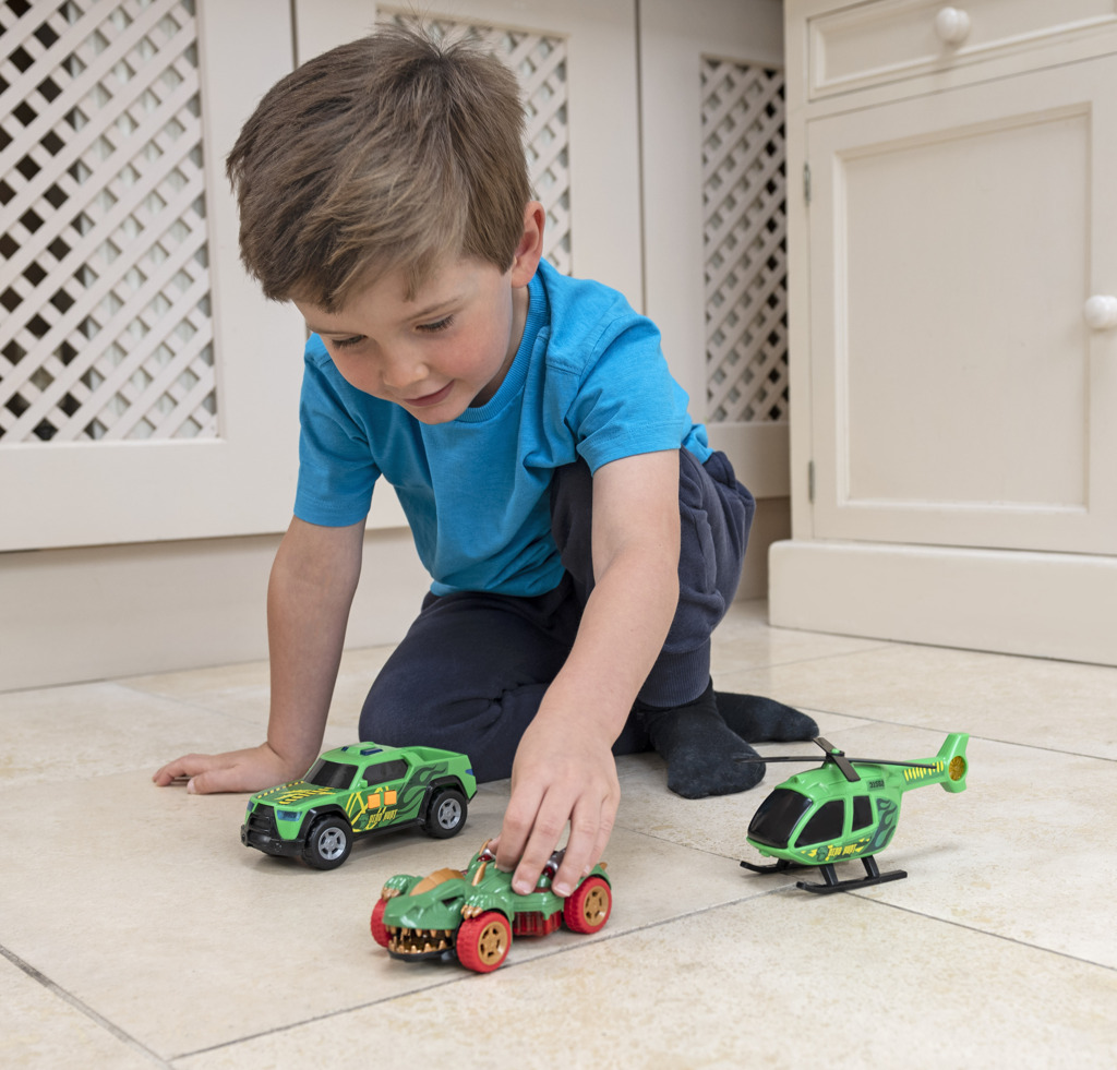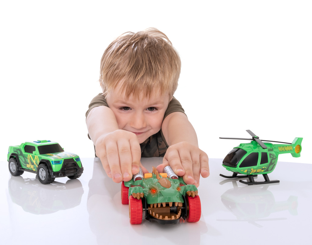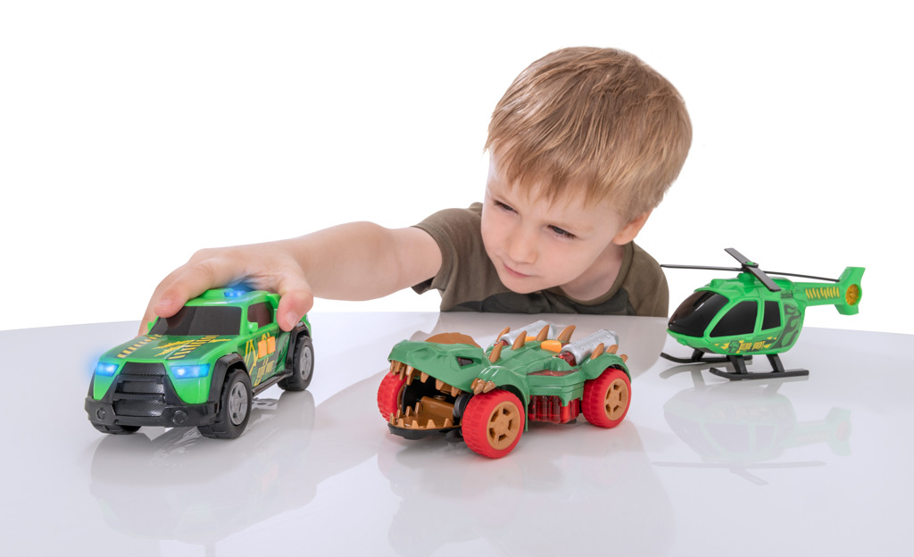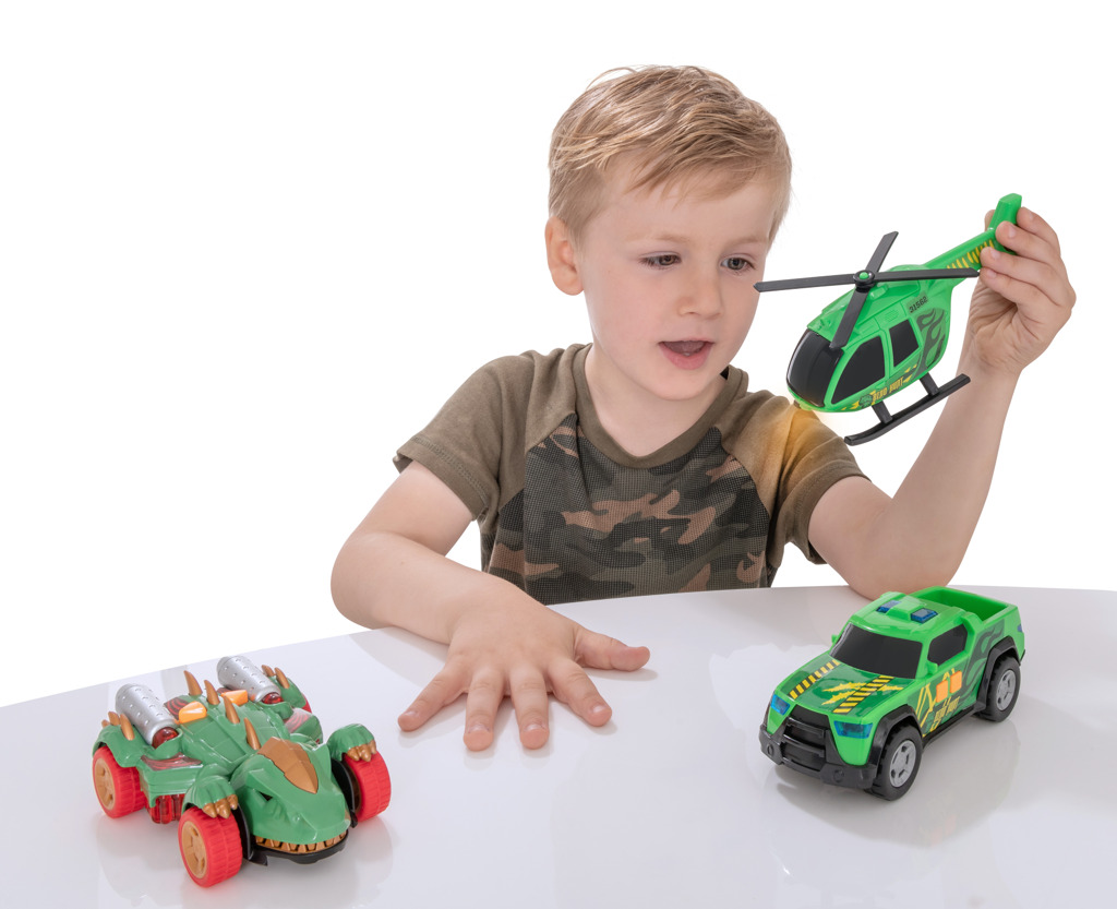 - Zažeň dinosaura s touto sadou Teamsterz! Tato sada obsahuje auto Monster Mini Dino s děsivými zvuky monster, zvuky motoru a blikajícími světly, helikoptéru Dino Hunt s ručně otáčejícími se listy vrtule, Dino Hunt pick-up s nouzovými sirénami a světly. Zatlačte podél volně se pohybujícího dinosaura, abyste spustili jeho cvakací čelisti. Perfektní dárek pro každého malého nadšeného řidiče, který nabízí hodiny nápadité zábavy! Vyžaduje 6× LL44 (součástí balení). Vhodné pro věk 3 roky +.