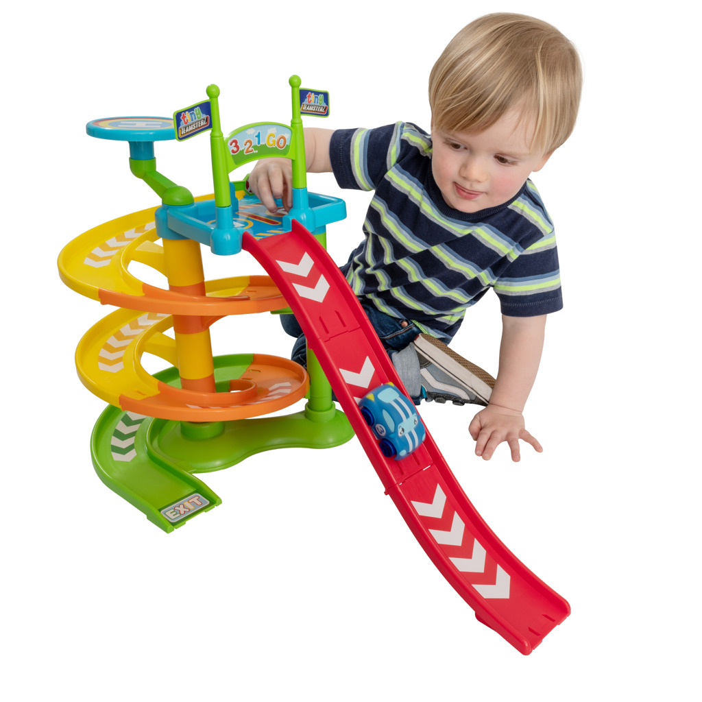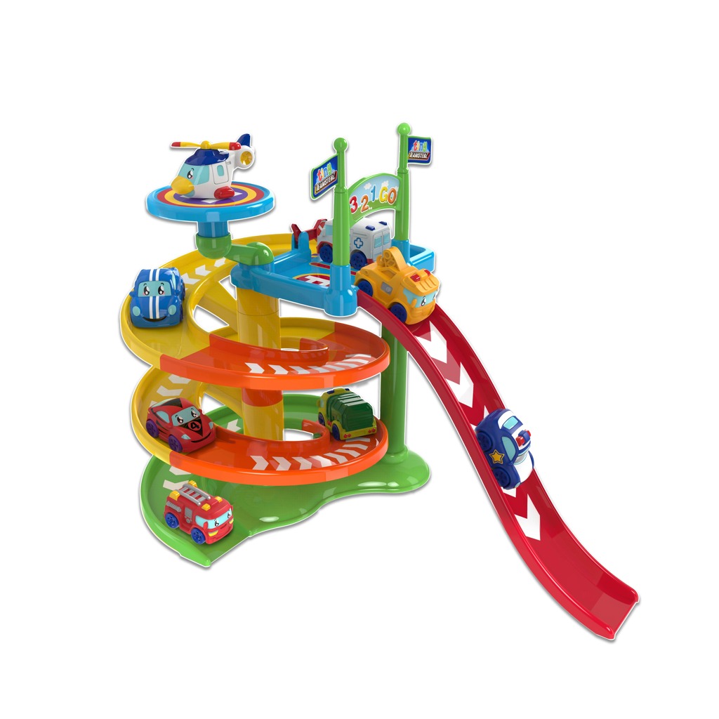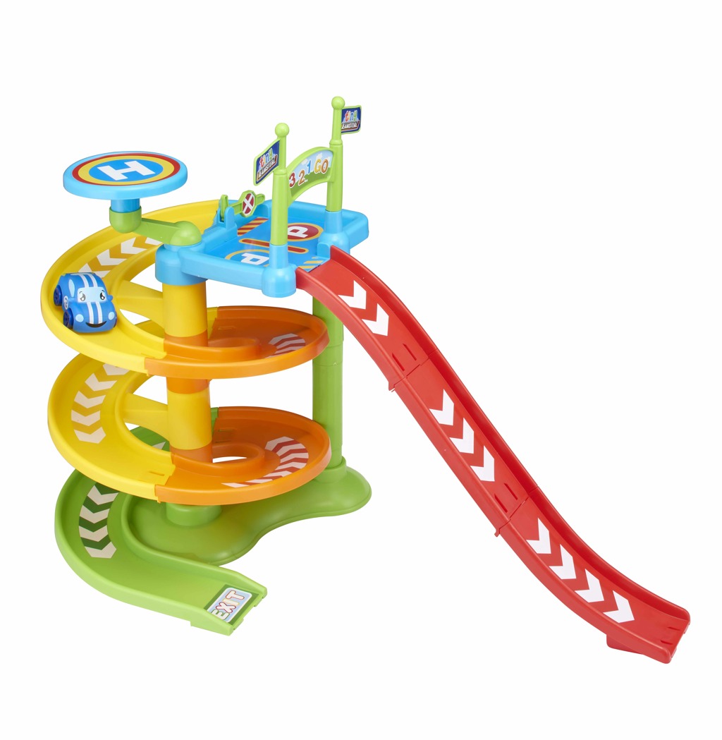 - Tato dráha je navržena v jasných, zábavných barvách a má zaoblený robustní design, ideální pro malé ručičky! Sjeďte po spirálové závodní dráze dolů nebo sjeďte přes rychlostní rampu s volným sportovním vozem. Součástí herní sady jsou také dvě parkovací místa a přistávací plocha pro vrtulníky. Perfektní dárek pro každého malého nadšeného řidiče, který nabízí hodiny nápadité zábavy! Vhodné pro věk 12m+.