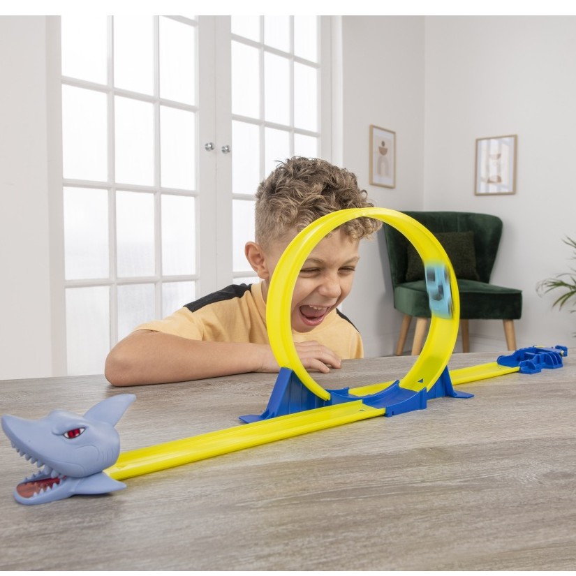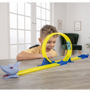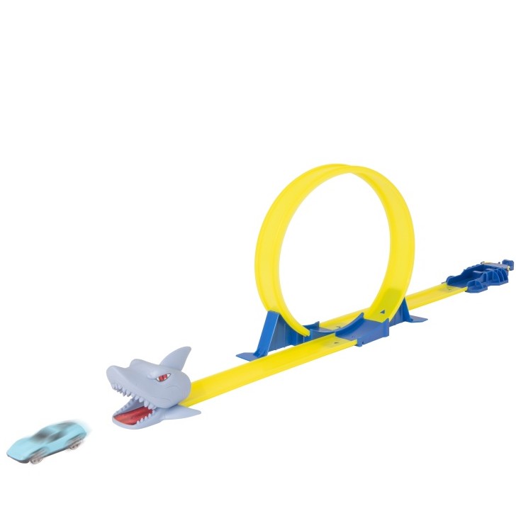 Balení obsahuje dráhu s jednou smyčkou s elastickým vystřelovačem a žraločí koncovkou.