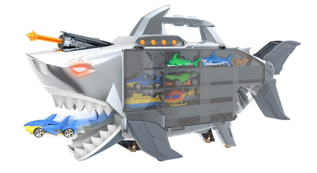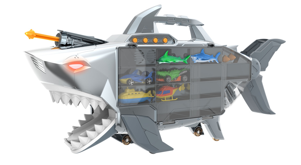 - Toto odolné pouzdro s motivem žraloka se snadno přenáší a posouvá, protože má volně pohyblivá kolečka, rukojeť pro mobilní hraní a má úložný prostor až pro 24 aut. S přidanými funkcemi, které zahrnují světla a zvuky, otevírací čelisti, vestavěnou rychlostní rampu a odpalovač raket. Tato sada obsahuje 2 auta, 2 námořní záchranná vozidla, 2 figurky žraloků a 3 rakety. Zahrnutá vozidla jsou v měřítku přibližně 3 palce a mají vysoce kvalitní tlakově lité detaily a nezávislá volně pohyblivá kola. Vhodné pro věk 3 roky +.