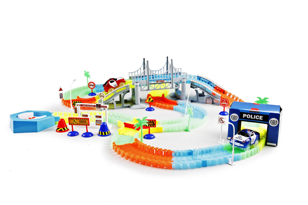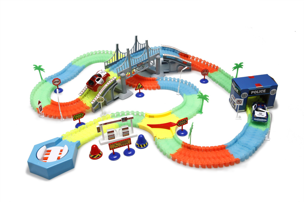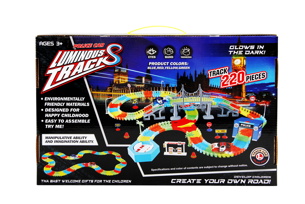 - Variabilní dráha svítící ve tmě, která má 220 dílů. Součástí sady je jedno autíčko s LED světlem, přemostění, policejní stanice, benzínová pumpa a jiné doplňky. Provoz této sady je na 2×1,5V AA baterie – nejsou součástí balení. V nabídce je červené nebo modré autíčko. Tato dráha je velice jednoduchá na sestavení.