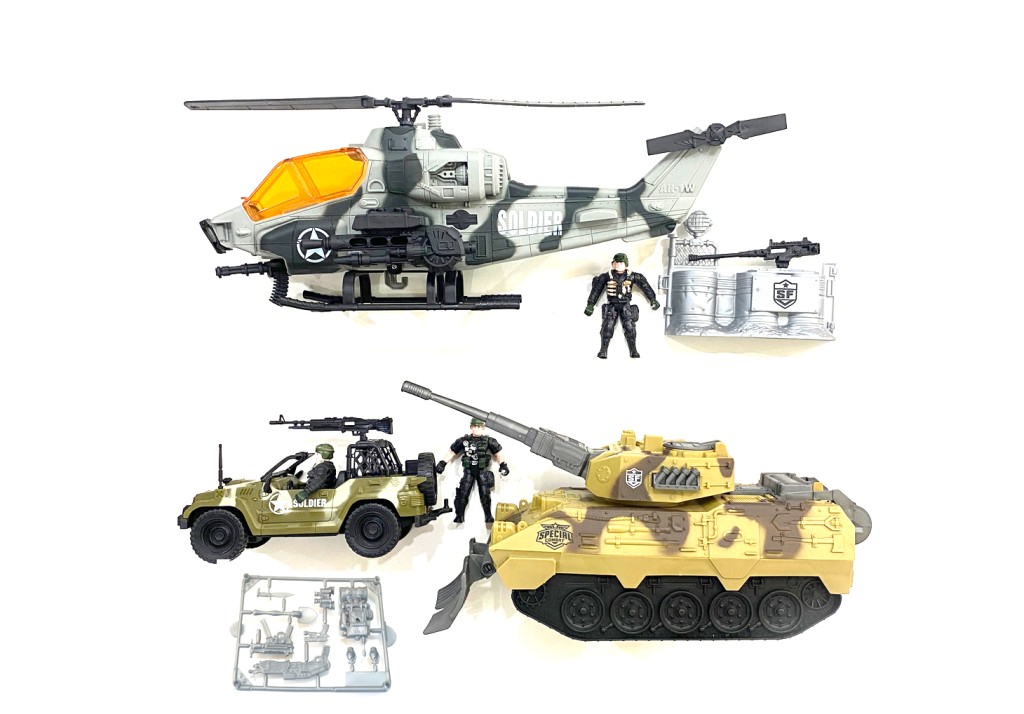 - Velká vojenská sada s tankem, bojovým vozidlem a helikoptérou. Součástí jsou figurky vojáků a spousta doplňků.