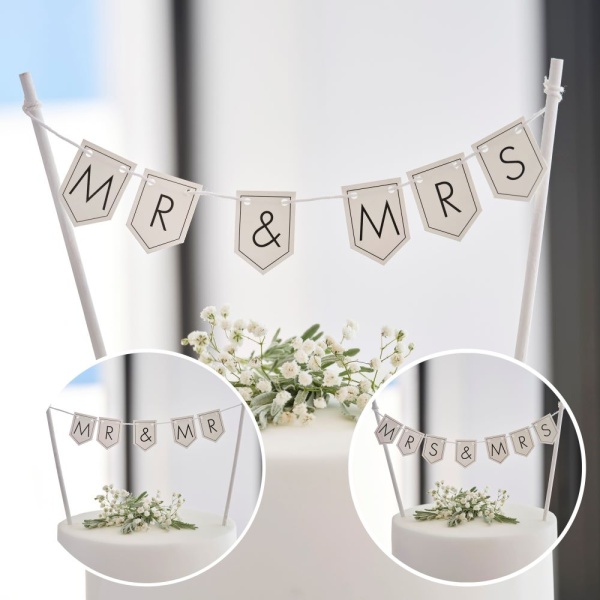 Originální ozdoba na dort novomanželů je tvořena vlaječkami s nápisy Mr & Mrs