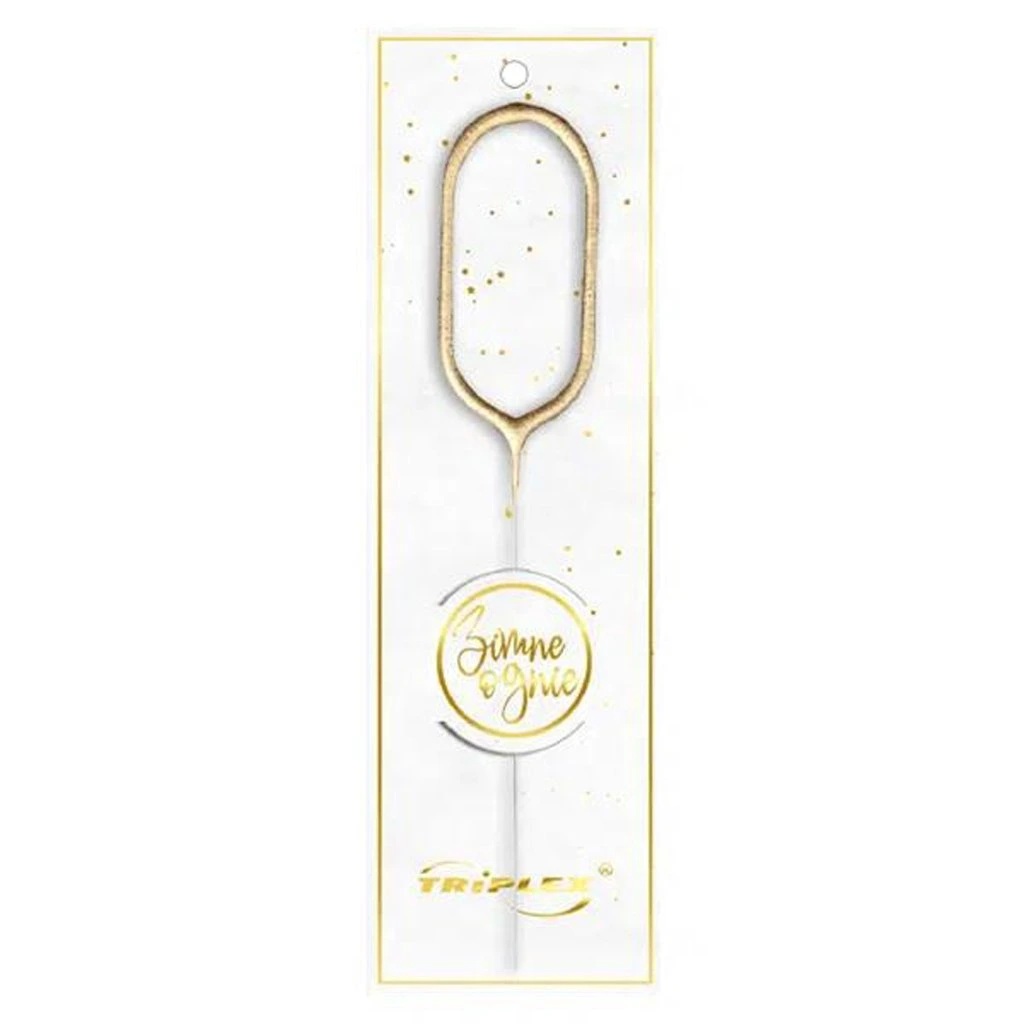Zlatá prskavka ve tvaru číslice "0" je vhodná pro slavnostní okamžiky jako jsou narozeniny, dětské oslavy či tematické párty.