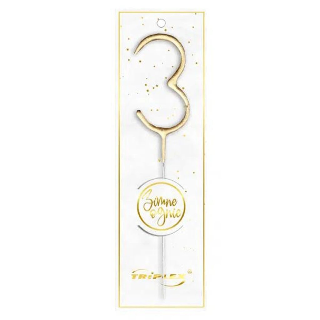 Zlatá prskavka ve tvaru číslice "3" je vhodná pro slavnostní okamžiky jako jsou narozeniny, dětské oslavy či tematické párty.
