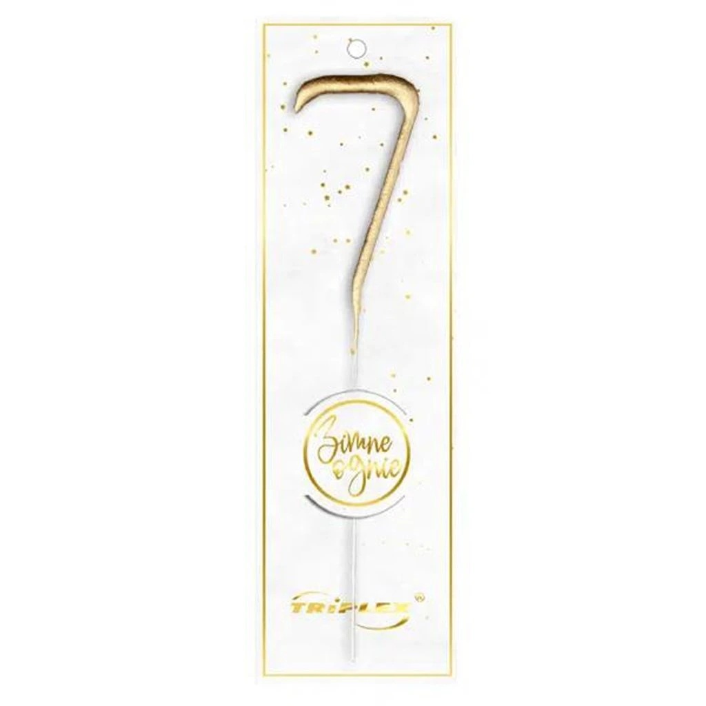 Zlatá prskavka ve tvaru číslice "7" je vhodná pro slavnostní okamžiky jako jsou narozeniny, dětské oslavy či tematické párty.