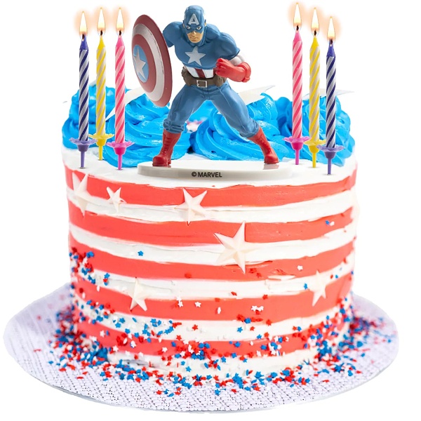 Sada na originální výzdobu dortu obsahuje cool figurku Kapitána Ameriky včetně podstavce z plastu a 10 ks barevných dortových svíček.
