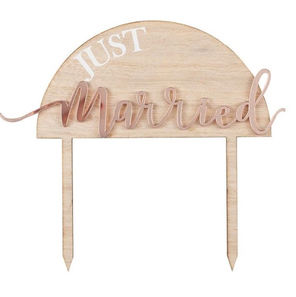Nádherná dekorace na svatební dort v dřevěném provedení tvořící nápis Novomanželé v barvě růžového zlata.