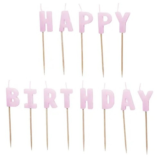 Svíčky na dort, tvořící nápis Happy Birthday mají světle fialový odstín a jsou výšky cca 2,5 cm.