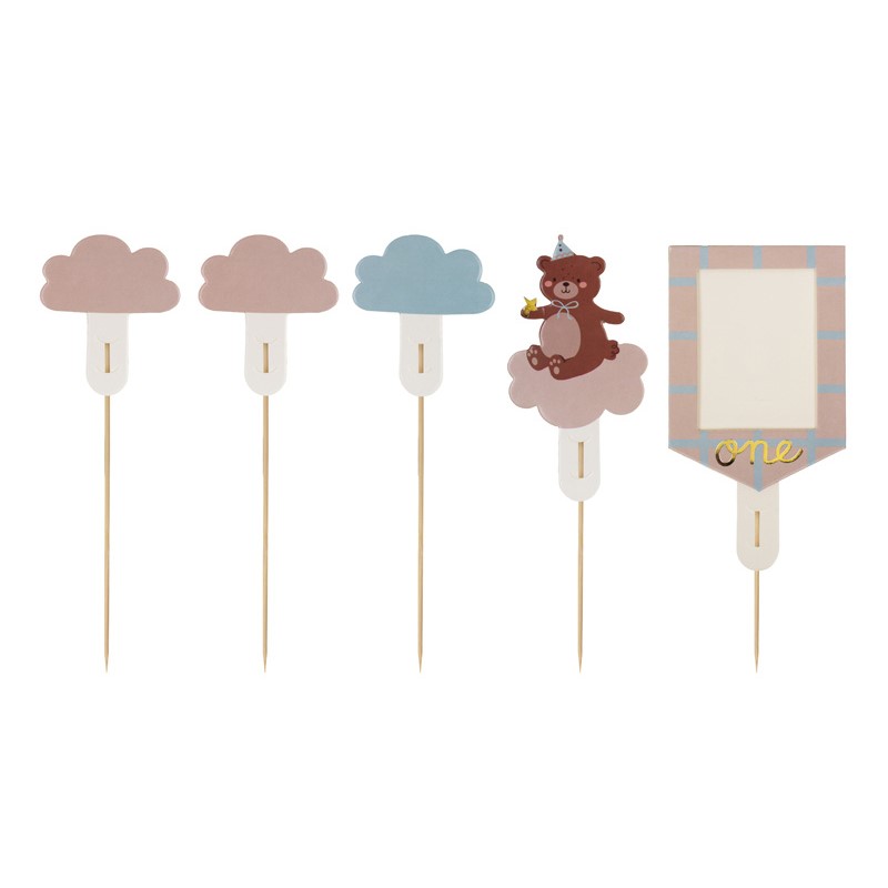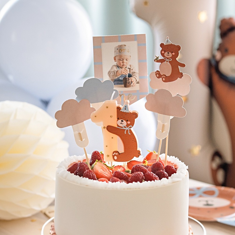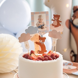 Zápich na narozeninový dort s Medvídkem v mixu vzorů a barev.