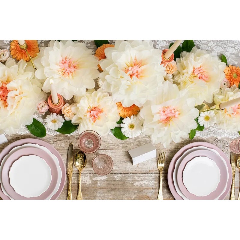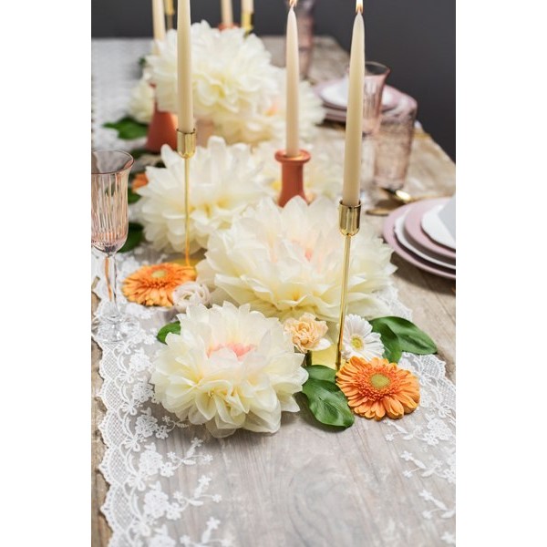 Světle krémové dekorativní papírové květiny vám vytvoří kouzelnou dekoraci na stůl.