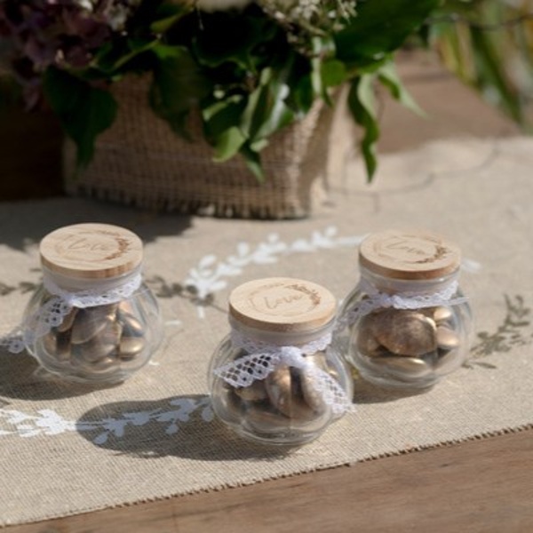 Díky této skleněné dózičce s dřevěným víčkem a nápisem Love budou vaše sladkosti například v podobě svatebních pralinek dobře prezentované a neodolatelné.