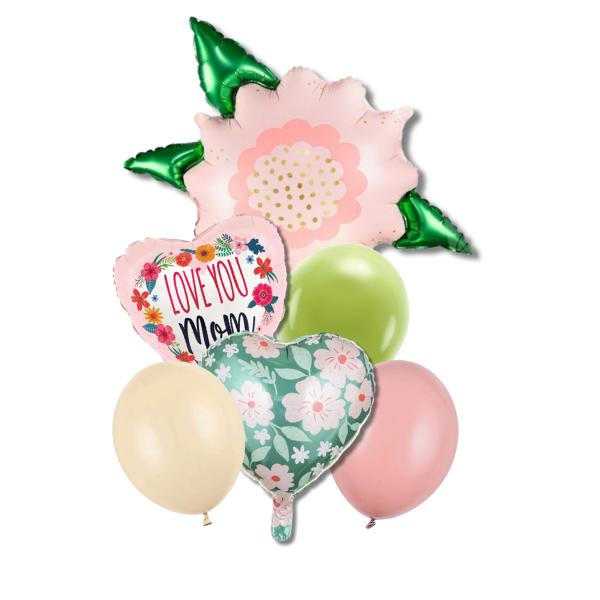 Stylový a moderní balónkový buket, který rozzáří oči každé maminky! Kombinace jemných pastelových tónů, květinových motivů a nápisu Love You Mom z něj dělá dokonalý dárek ke Dni matek nebo jiné výjimečné příležitosti.