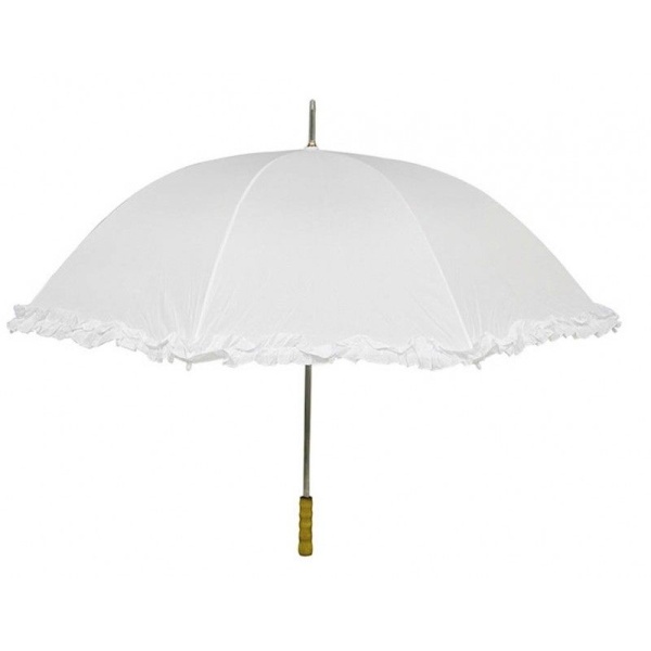 Vdáváte se v bílém? Potom pro vás máme krásný a velký svatební deštník v bílé barvě. Je velmi elegantní a bude úžasným doplňkem k vašim šatům a v létě vás zároveň ochrání před poledním sluncem. Má dřevěnou rukojeť a kolem dokola malý volánek. Nechybí mu ani automatické otevírání.