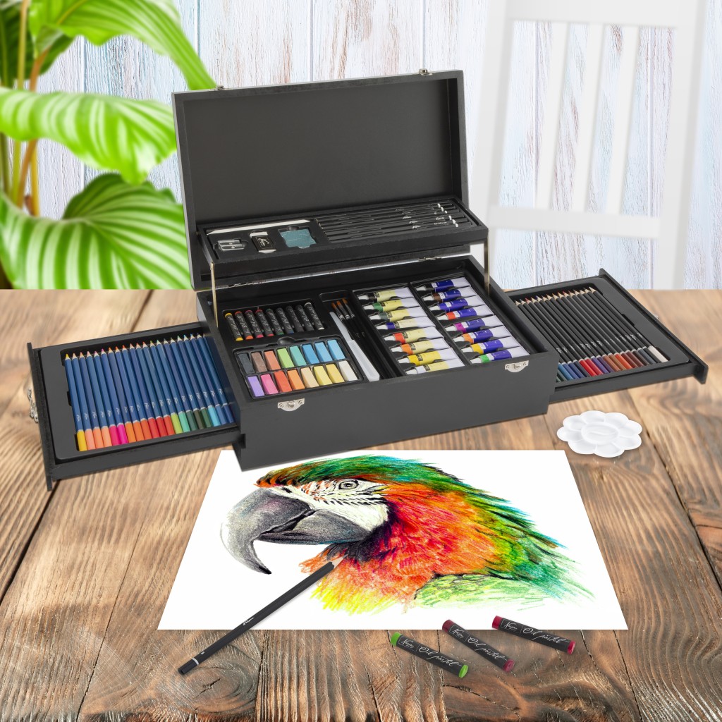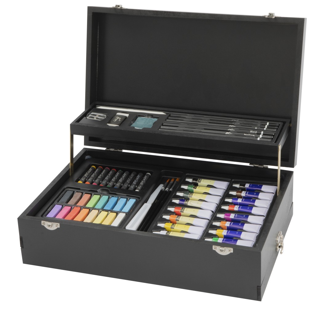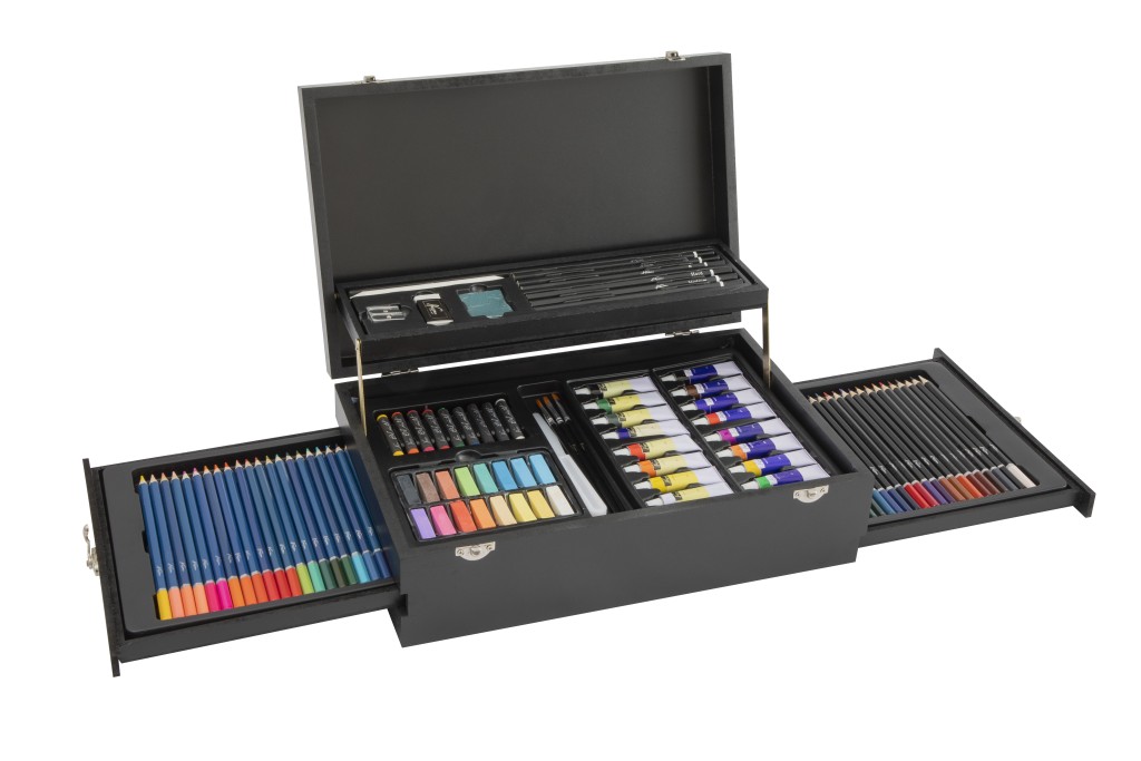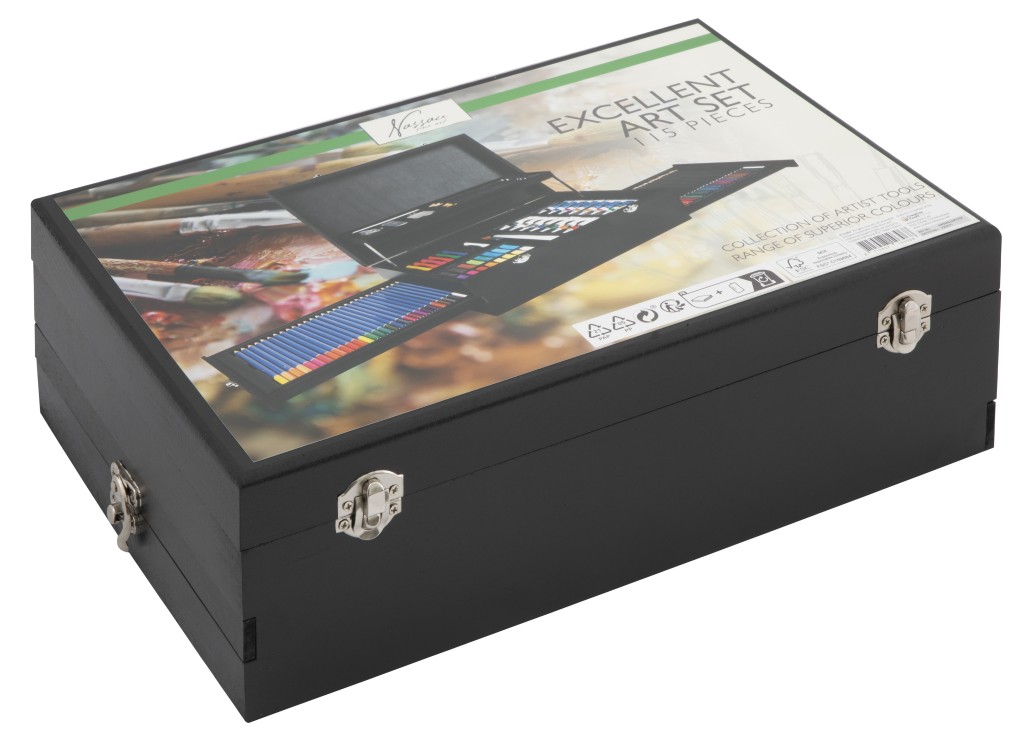 Malířský kufřík patrový Excellent – dřevěný rozkládací, patrový kufřík obsahuje vše pro malíře – barevné křdy, pastelky, baravy, ořezávátko, gumu, štětce atd. celkem 115 ks.