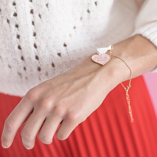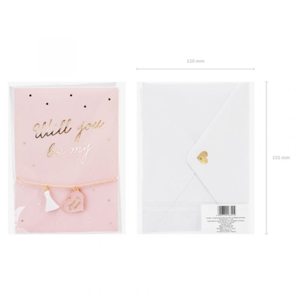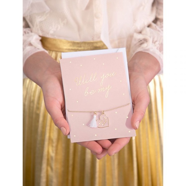 Karta v růžové barvě s nápisem „Will you be my“ a 2 náramky s nápisem „Maid of Honor“.