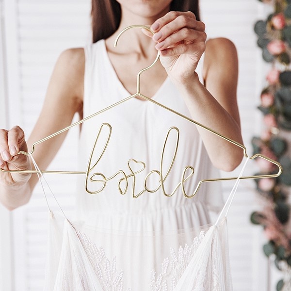 Ke každé krásné nevěstě patří krásné svatební šaty. K jejím šatičkám nabízíme toto dekorativní ramínko ve zlatém provedení, tvořící nápis Nevěsta.