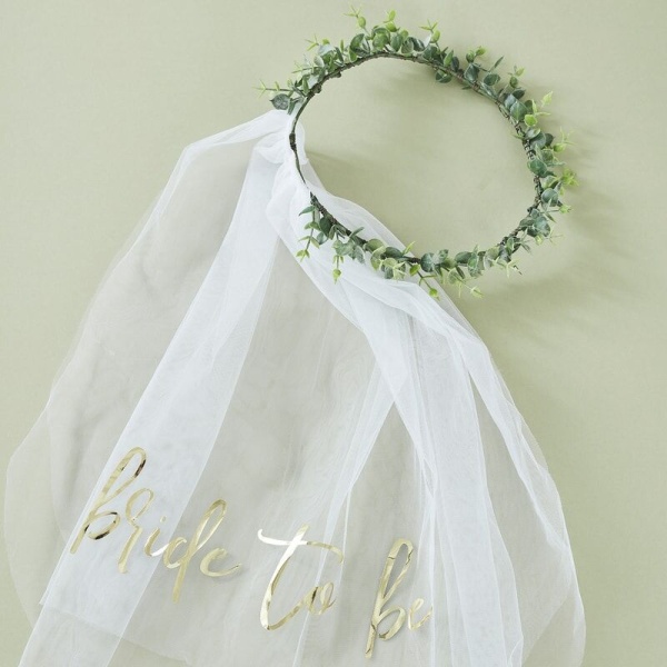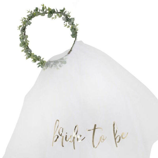 Abyste mohla oslavit rozlučku se svobodou ve velkém stylu, nesmí vám určitě chybět tento krásný bílý závoj s eukalyptovým věnečkem a nápisem Bride to be.