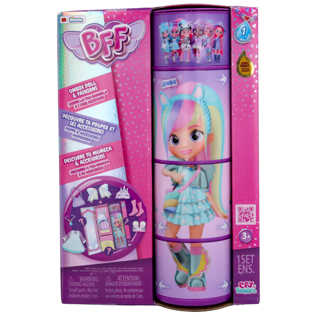 • „Cry Babies BFF je sběratelská módní panenka, která ti umožní vyjádřit se, hrát si s módou a ztotožnit se svou oblíbenou postavou z animovaného seriálu Cry Babies Magic Tears. Panenka je vysoká 20 cm, má 15 cm dlouhé, hedvábné nylonové vlasy a spoustu módních doplňků. Tělo panenky má 6 ohebných kloubů pro polohování. Balení je pohyblivé, má otočné válce díky kterým můžeš vidět jak panenka zaujímá různé pózy. Uvnitř balení se nachází panenka a také 9 kusů příslušesntví: 2 kusy oblečení, kabelku, čepici, pár odpovídajíích bot s párem ponožek a náhrdelník!“