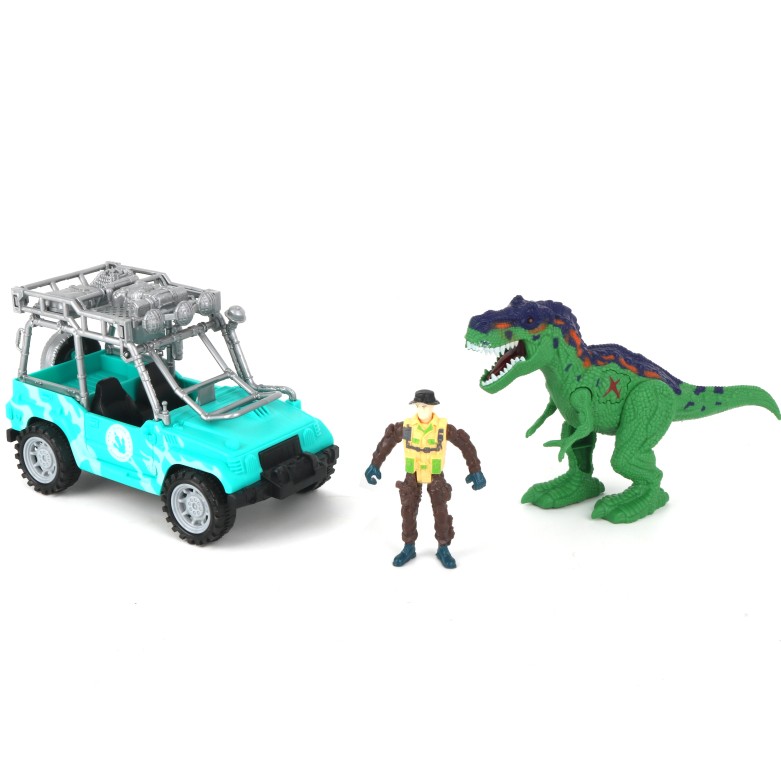 Hrací set s dinosaurem, autem a figurkou je se světelným a zvukovým efektem.