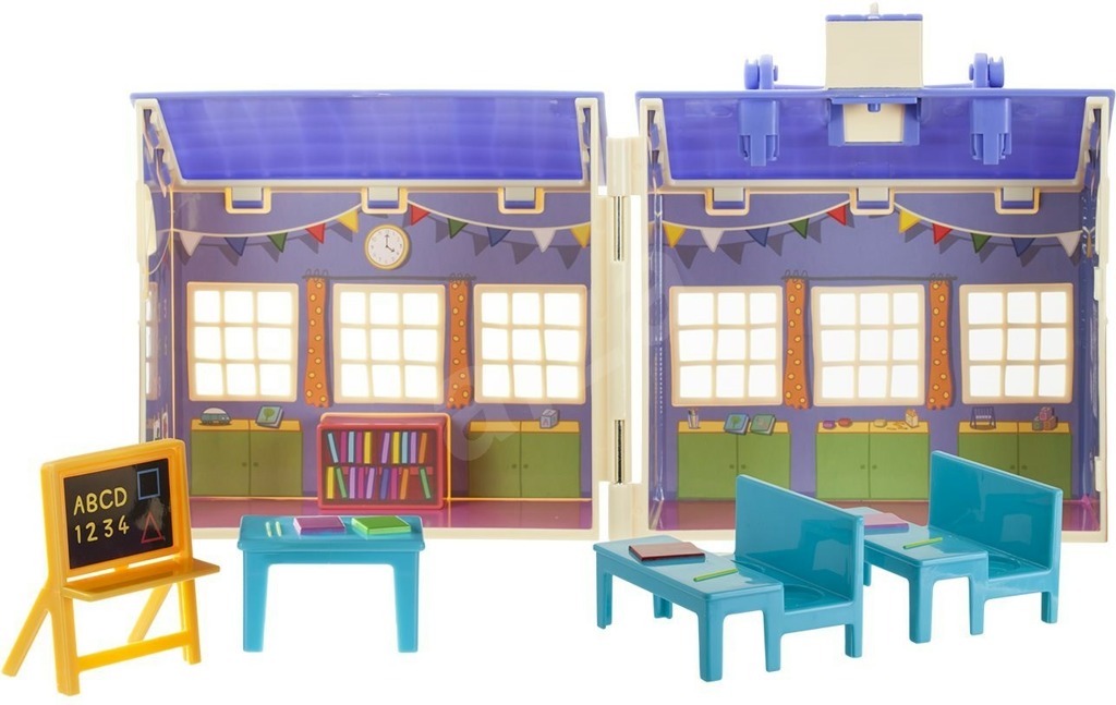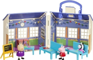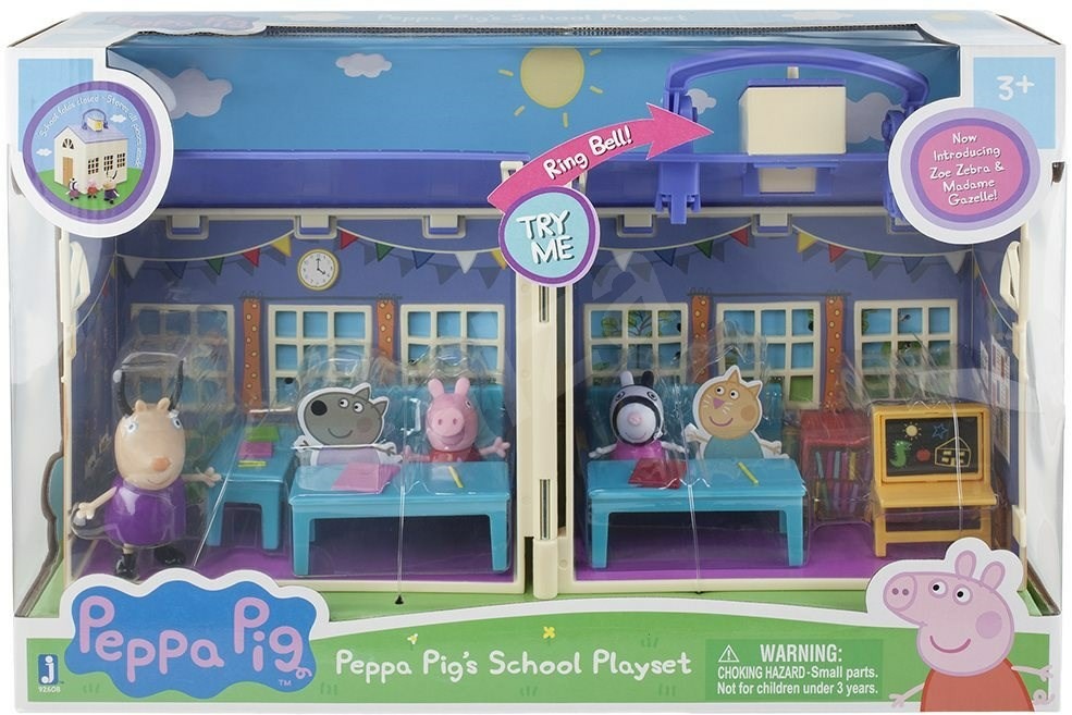 - I ve škole může být velká zábava! Zasedněte do školních lavic a užijte si s prasátkem Peppou a se zebrou Zoe spoustu zábavy ve školní třídě. Začátek hodiny oznámí zvonek, který je na střeše.Balení obsahuje: školu, 2 školní lavice, 2 židle, knihovnu s knížkami, otočnou tabuli, stůl pro učitele a 3 figurky: Peppu, zebru Zoe a slečnu Gizeli. Výška figurek: 5 – 7 cm.