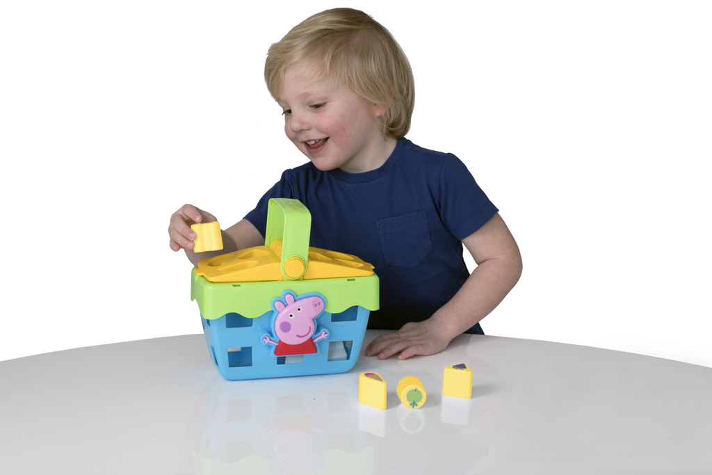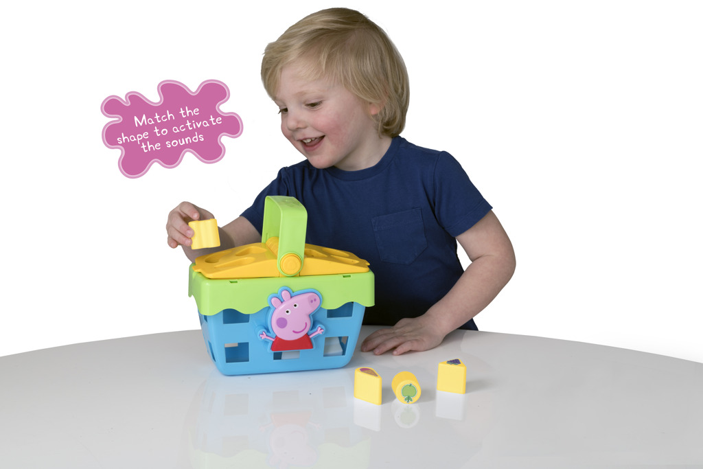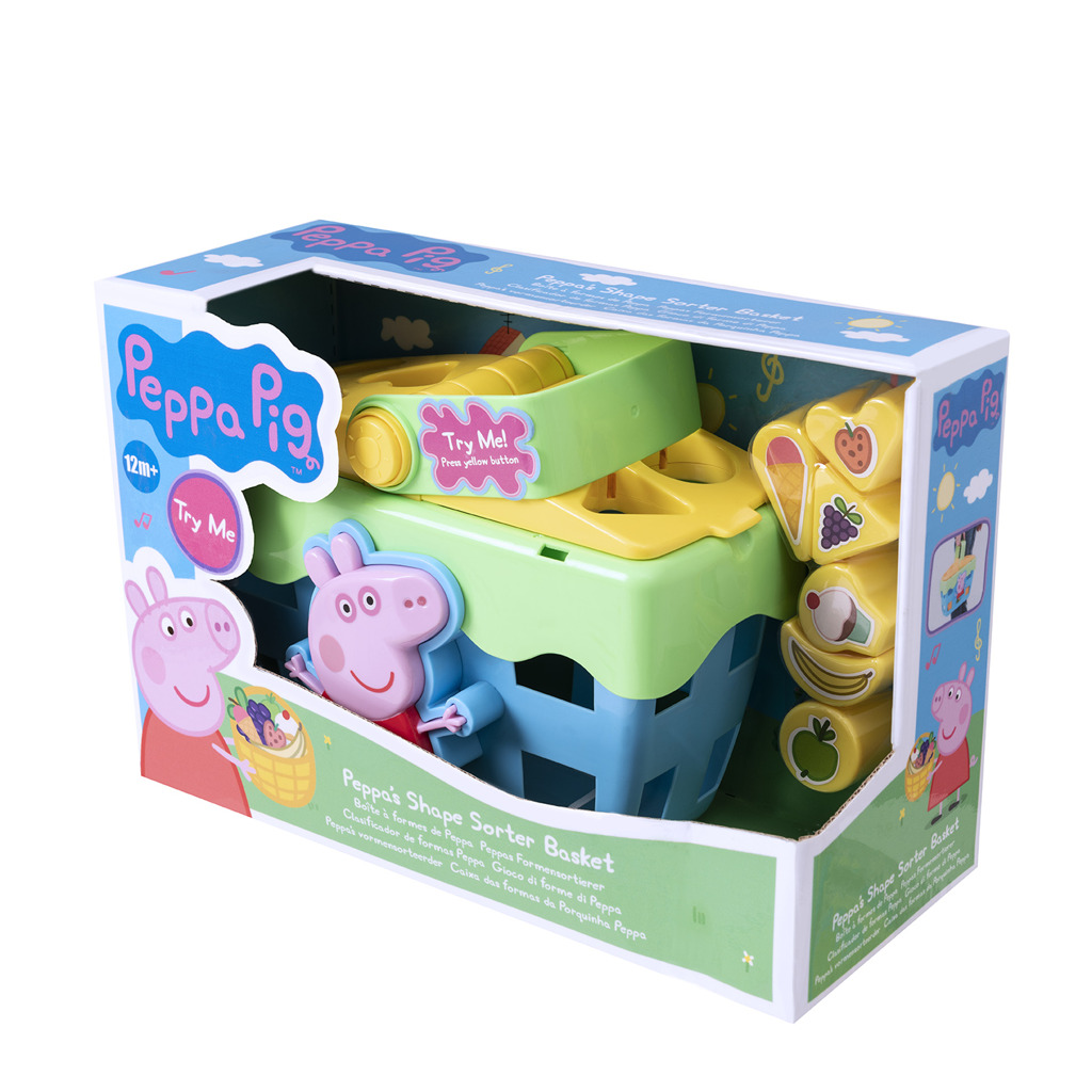 - Koíkš Peppa Pig je také třídič tvarů! Stisknutím tlačítka slunce na přední straně rukojeti aktivujete motiv Peppa Pig. Hračka na třídění tvarů rozvíjí důležité dovednosti při řešení problémů v rané fázi vývoje dítěte. Vaše děťátko bude fascinováno, když vymyslí, který tvar se hodí do kterého prostoru. Set obsahuje 6 tvarovaných dílků s grafikou jídla z výstavy Peppa Pig. Vyžaduje 2 x AAA baterie. Vhodné pro věk 12 měsíců +.