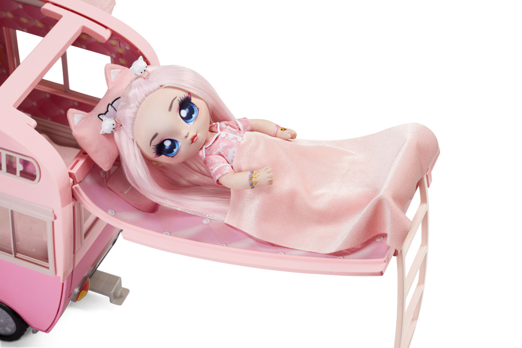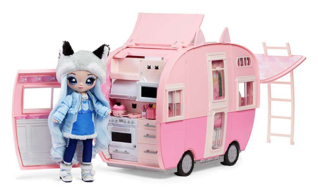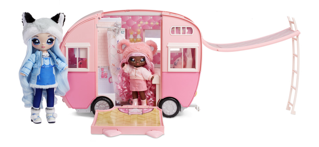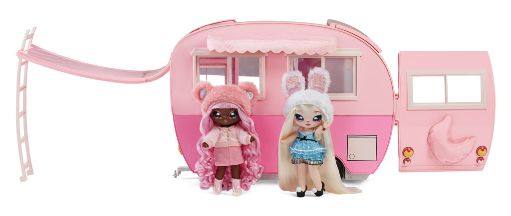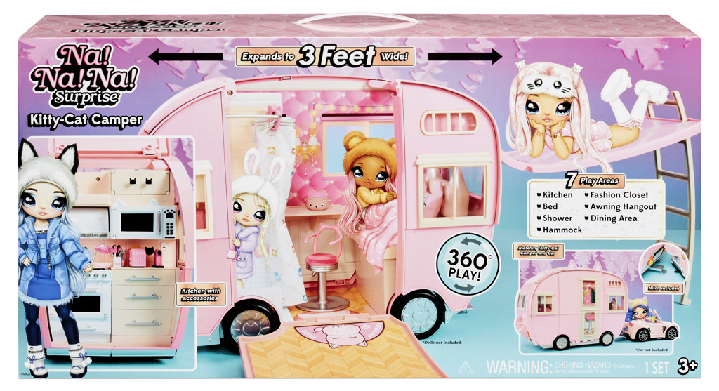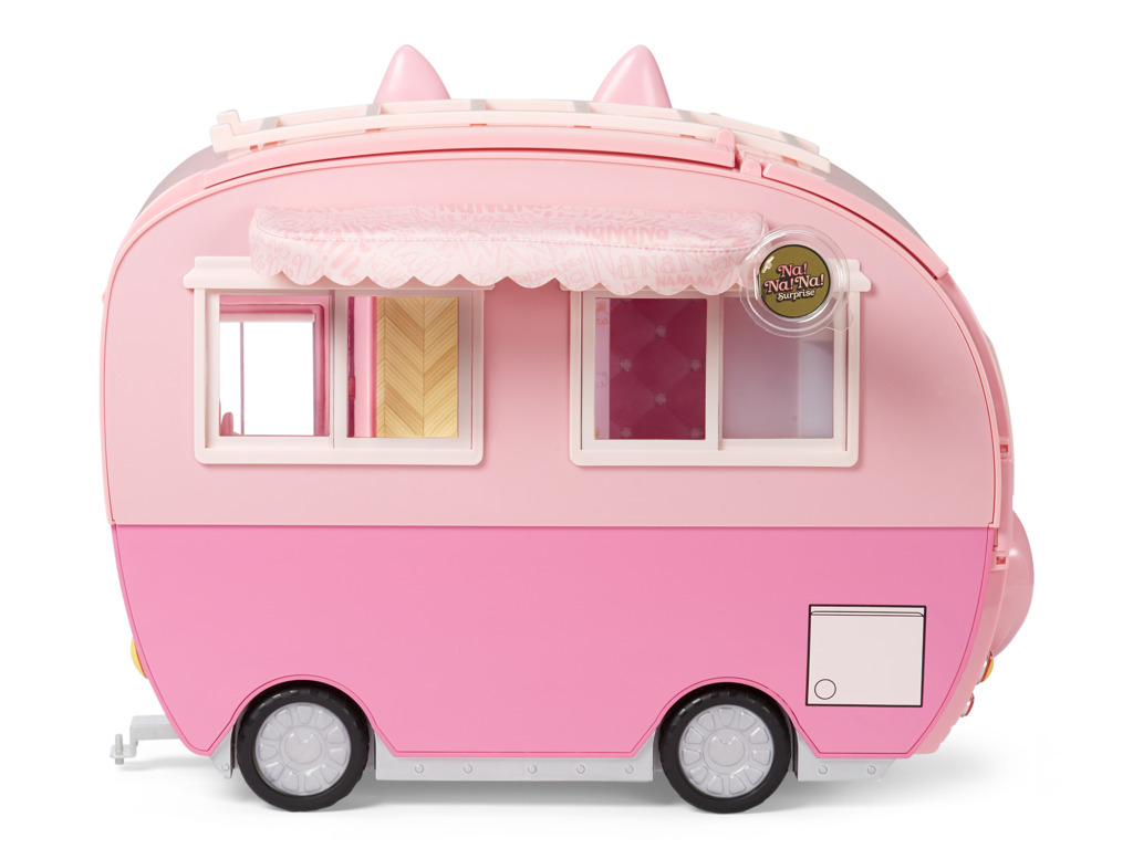 - "Na! Na! Na! Surprise Panenky i Teenagerky mohou vyrazit na cesty v útulném pohyblivém růžovém karavanu s kočičími detaily. Vysuň horní, přední a boční panel a Karavan rozložíš na 7 hracích ploch jako je kuchyň s mikrovlnkou a troubou, houpací síť, postel, stolička, sprcha, šatník a další. Karavan má funkční okna, zásuvky a mnoho měkkých doplňků s kočičími detaily. Karavan můžeš zapojit za Na! Na! Na! Stylový kabriolet.