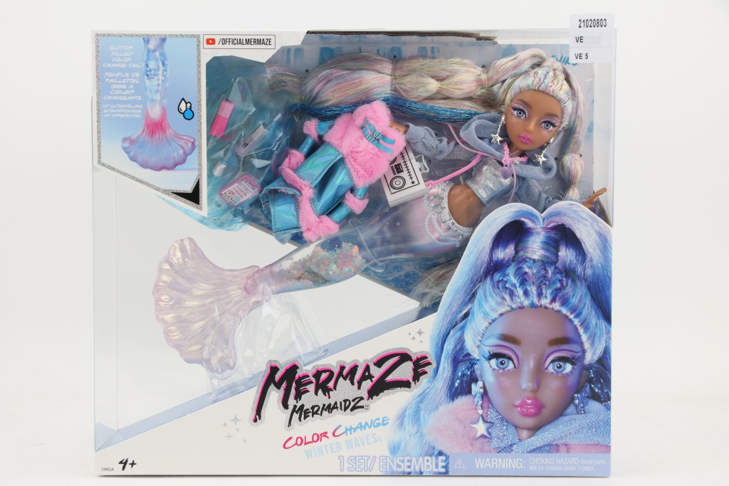 - Každá panenka Mermaze Mermaidz™ Winter Waves™ má okouzlující ocas plný třpytek. Několikrát ji otočte panenku hlavou dolů a dozadu, abyste viděli, jak se třpytky lesknou! Panenky mají unikátní ploutev, která mění barvu, když se ponoří do ledové vody. Její ploutev se mění z lesklé růžové na přechodovou růžovou a modrou! Panenky mají na sobě fashion oblečky a spoustu doplňků. Každá panenka Mermaze Mermaidz™ Winter Waves™ má pohyblívý krk, ramena, lokty, zápěstí, trup, pas a ploutve. Panenka má krásné dlouhé vícebarevné duhové vlasy, které nosí napůl dolů, napůl nahoru s dlouhými volnými kadeřemi. Má krásné skleněné oči a skutečné řasy a navíc okouzlující make-up s růžovými očními stíny. Před aktivací změny barvy ploutve sundejte panenceoblečení, aby se nenamočilo. Pak její ploutev polijte ledovou vodou nebo ji ponořte do nádoby s ledovou vodou. Ideální pro hraní ve vodě i mimo ni! Upozorňujeme, že vlasy panenky mohou po ponoření do vody vypadat jinak. Ideální teplota vody 0 stupňů C. Sbírejte i další penky Harmonique™, Kishiko™, Nera™, Crystabella™ a Gwen™.