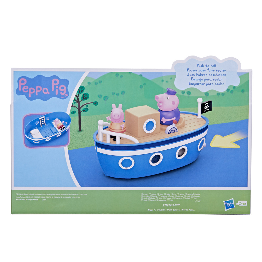 - Předškoláci a všichni kdo mají rádi prasátko Peppa si budou rádi představovat všechna místa, kam by s Peppou mohli cestovat v této snadno otevíratelné lodičce! Figurka Peppy, která je součástí balení, může plout na horní palubě nebo v podpalubí. Loďka má skutečná posuvná kolečka, figurku prasátka dědečka a odnímatelnou horní desku.