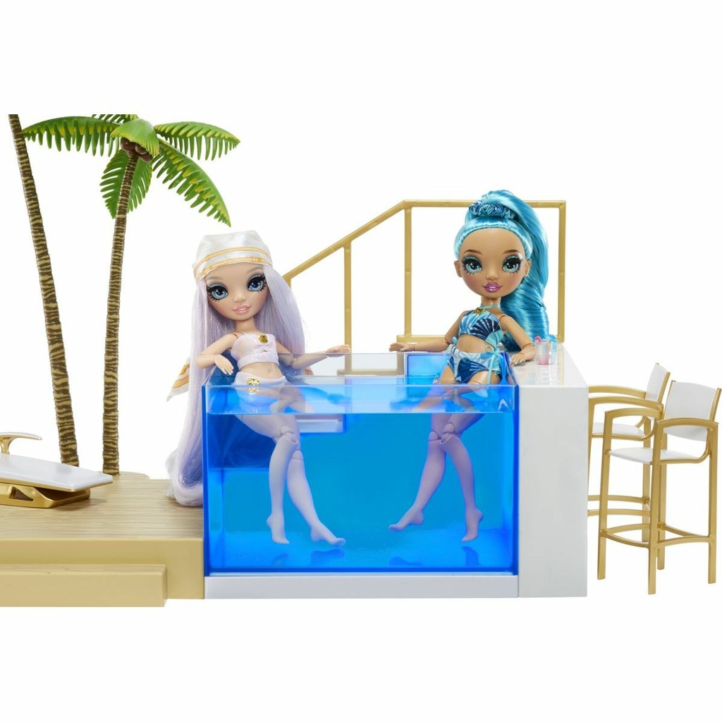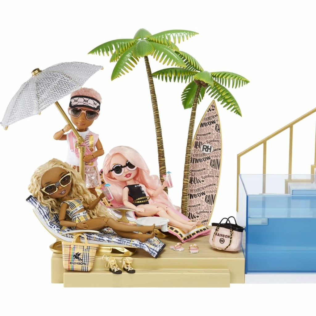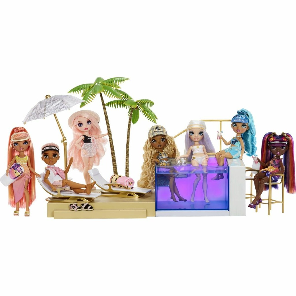 - Dívky z Rainbow High školy jsou připraveny vyrazit na sluníčko a ponořit se do úžasného bazénu, který mění barvy. Bazén se rozzáří barvami duhy a vytvoří scénu pro neopakovatelnou letní párty Rainbow High. Napuštění a vypuštění bazénu je úplně jednoduché. A samozřejmě u něj najdete různé nezbytné plážové doplňky.
