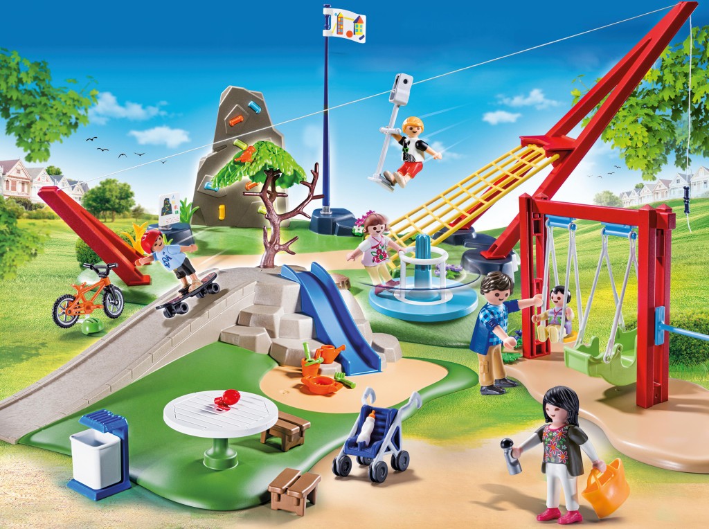 - Sada dětské hriště z řady Playmobil. Připravte se na zábavné odpoledne na hřišti.Je tam rampa pro skateboardisty a cyklisty a lezecká stěna. Rozběhněte se po šplhací síti a vzneste se na houpačce. Je tu něco pro každého! Po všech akcích si udělejte přestávku na svačinu na piknikovém stole. Najde i velkou modrou skluzavku nebo kolotoči. Sada obsahuje dvě figurky dospělých, dvě dětské figurky, jednu figurku miminka, skateboard, kolo, kočárek, tašku a plně vybavený dětský park s mnoha zábavnými doplňky.