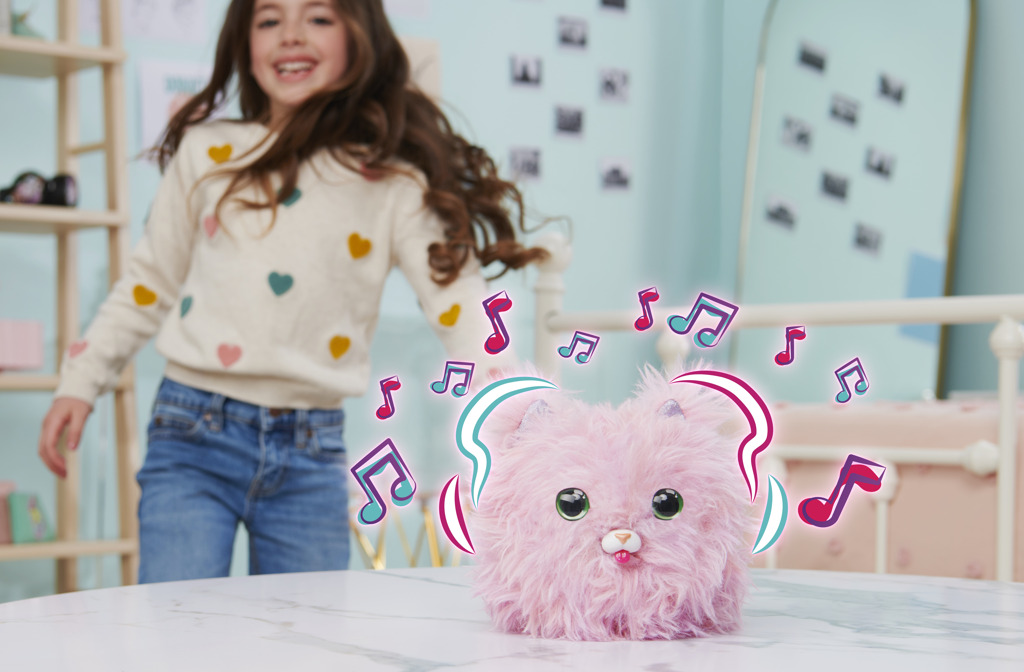 - Roztomilé koťátko, které se pomocí hry odhalí z plyšové chlupaté kuličky o velikosti cca 20 cm. Máš spoustu možností interaktivní zábavy jako házení, koulení, krmení, písničky a hry. Fur Fluffs má více než 50 zvuků a reakcí. Hračka je určena pro děti od 5 let