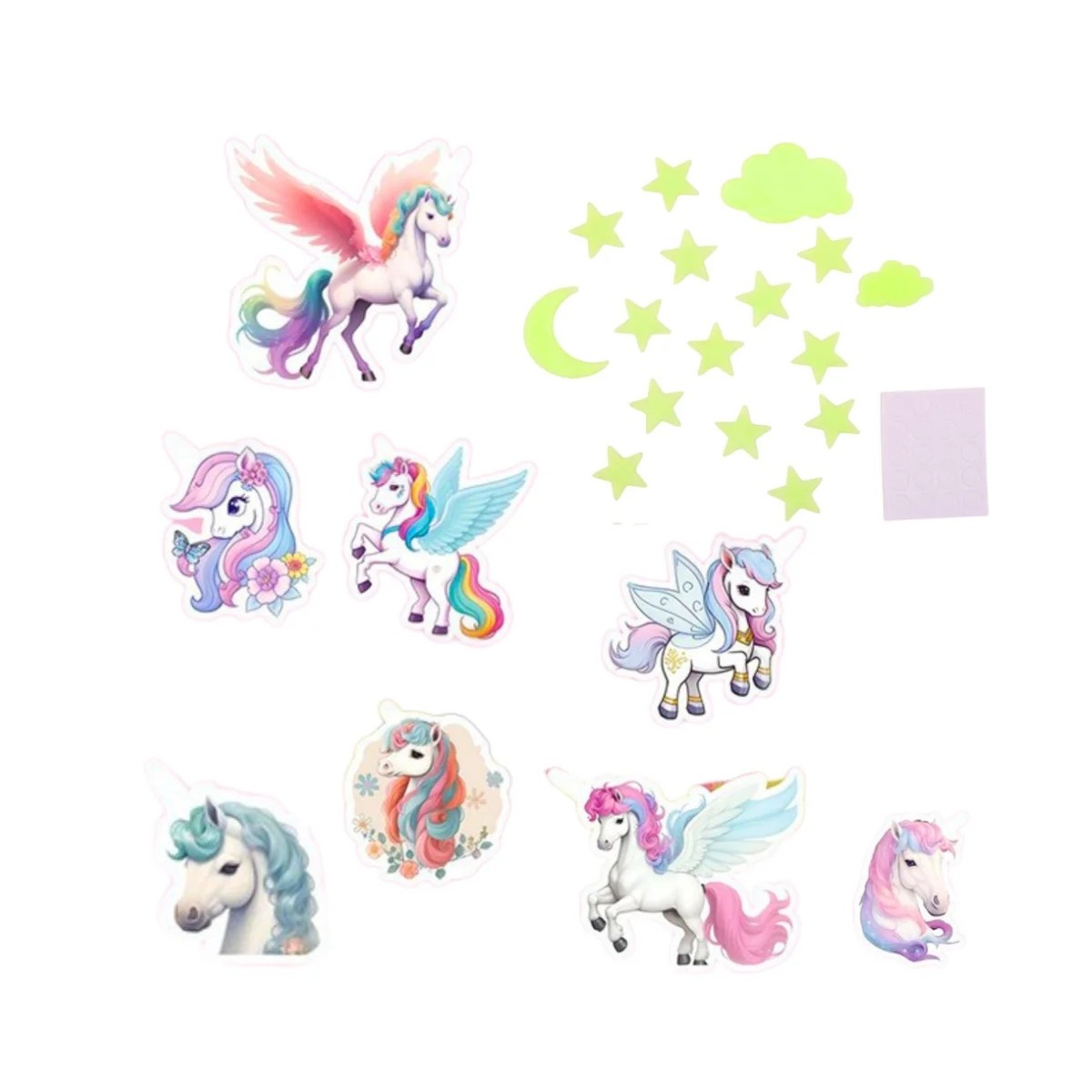 Tato sada zářících samolepek s jednorožci a hvězdami dodá každému dětskému pokoji kouzlo a teplo. Vesele barevné přes den, ale v noci zářící jemným světlem, vytvářejí uklidňující a nápaditou atmosféru, ideální pro zdobení dětských vysněných světů.