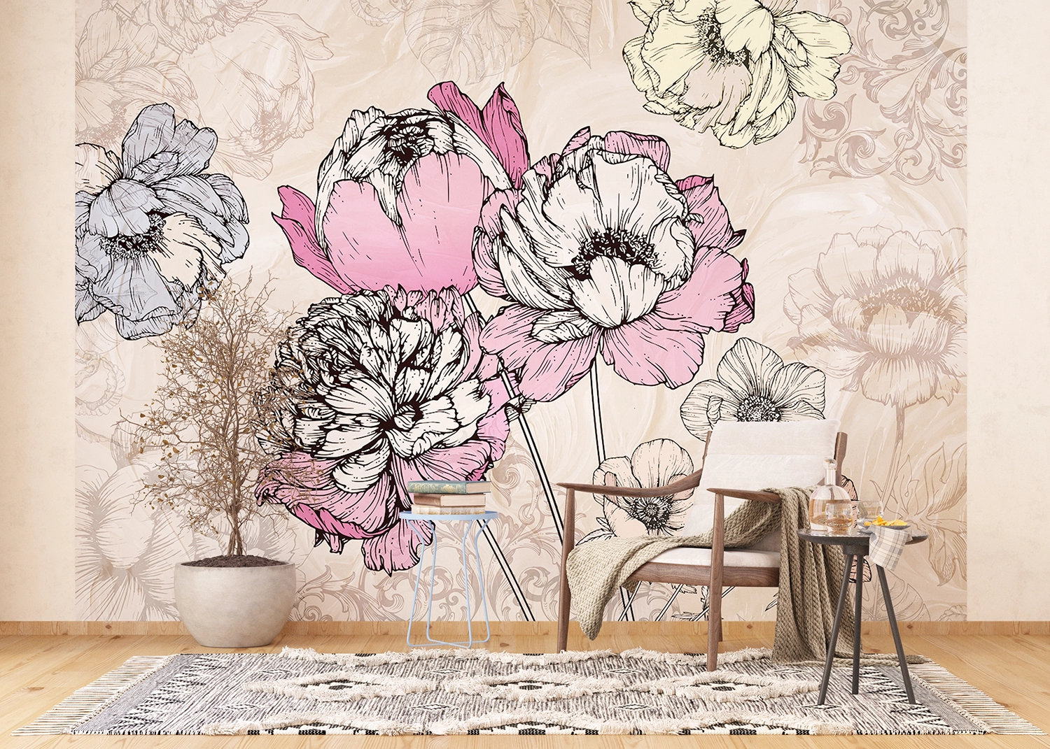 Vliesová fototapeta na zed' Tuší kreslené květy | 375 x 270 cm | FTNXXL 1230