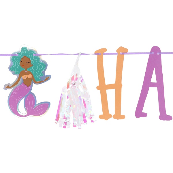 Banner se skládá ze dvou částí: jedna je s textem "HAPPY BIRTHDAY" (písmena jsou vysoká cca 14 cm) s mořskou pannou a duhovým fóliovým střapcem na obou stranách, mezi dvěma slovy je také mořská panna. . Na druhém banneru visí text „MERMAID MAGIC“ (výška písmene cca 14 cm) s duhovou mušličkou a duhovým fóliovým střapcem na obou stranách. Díky použité technice horkého embosování se duhové mušle opravdu třpytí.