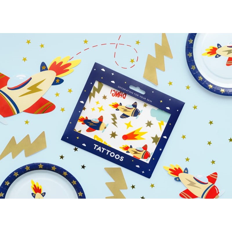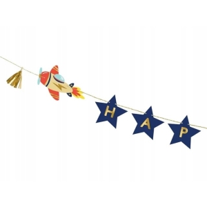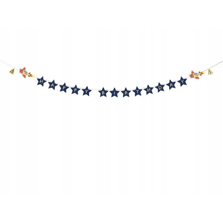 Narozeninový banner s nápisem Happy Birthday je vyrobený z papíru a zdobený dvěma zlatými střapci a letadýlky.