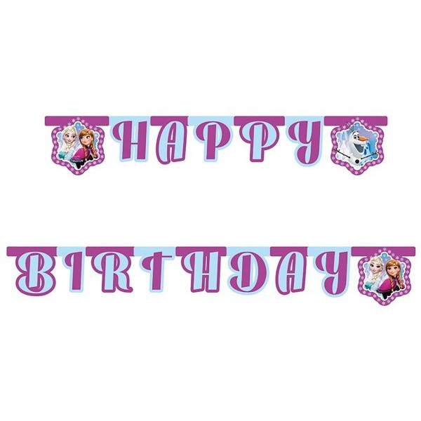 Narozeninový banner s nápisem Happy Birthday s obrázky princezen z Ledového království Elsy, její sestry Anny a sněhuláka Olafa.