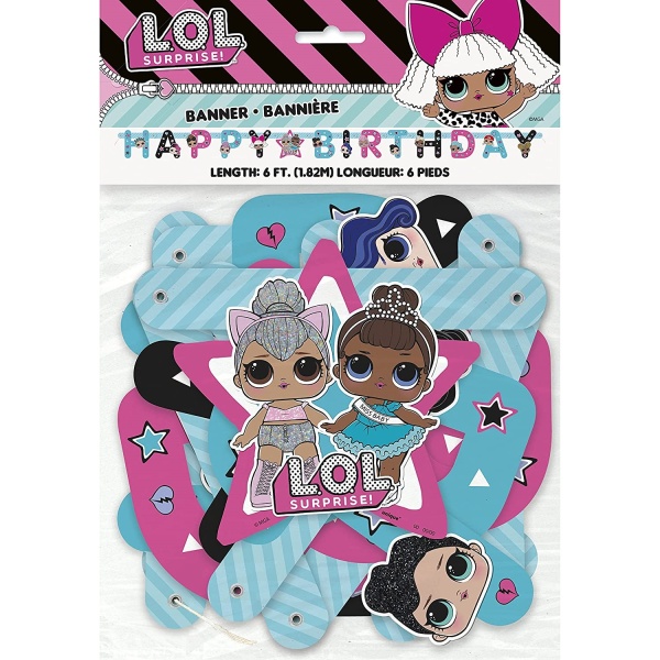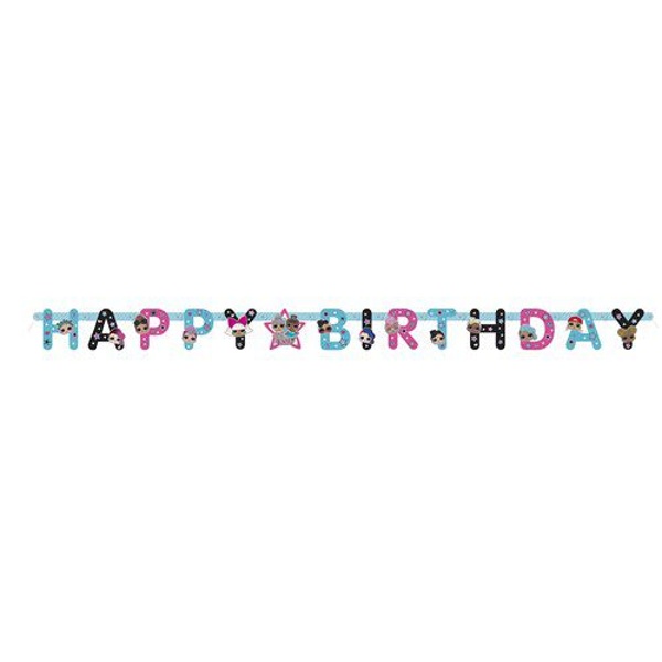 Banner s panenkami Lol Surprise a textem Happy Birthday je krásný doplněk výzdoby oslavy narozenin ve stylu LOL Surprise.